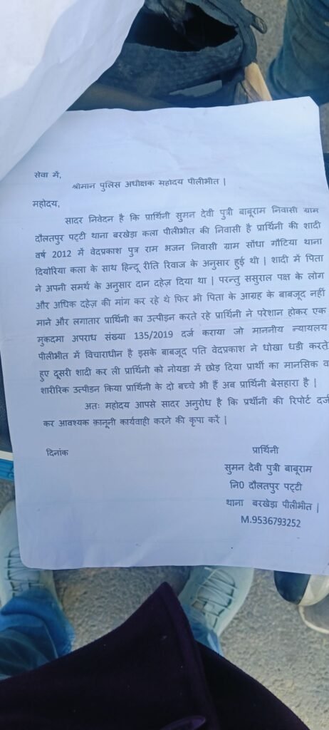 थाना बरखेड़ा क्षेत्र के गांव दौलतपुर पट्टी निवासी सुमन देवी पुत्री बाबूराम ने पुलिस अधीक्षक को दिए गए शिकायती पत्र में बताया है कि उसकी शादी 2012 में हिंदू रीति-रिवाज के साथ सोंधा गौंटिया निवासी वेदप्रकाश पुत्र रामभजन के साथ हुई थी जिसमें उसके माता-पिता ने अपनी हैसियत के अनुसार दान दहेज दिया था अब ससुराल वाले दहेज की मांग को लेकर उसका उत्पीड़न कर रहे हैं परेशान होकर महिला ने मुकदमा अपराध संख्या 135/2019 न्यायालय में दायर किया है जो कि विचाराधीन है इसके बावजूद पति वेदप्रकाश ने धोखाधड़ी कर दूसरी शादी कर पीड़िता को नोएडा में छोड़ दिया है उसके दो बच्चे हैं महिला अब बेसहारा है महिला ने पुलिस अधीक्षक को शिकायती पत्र देकर कार्रवाई करने की मांग की है।